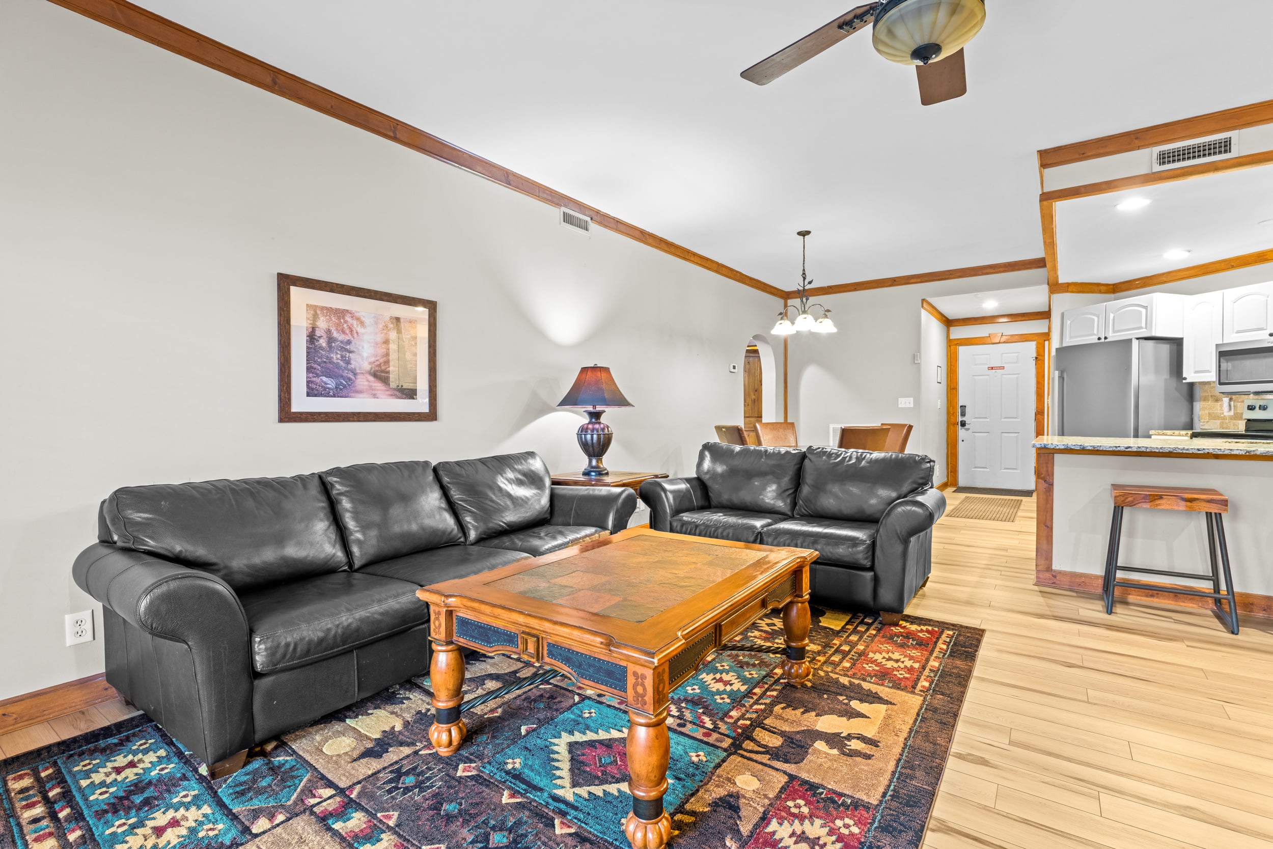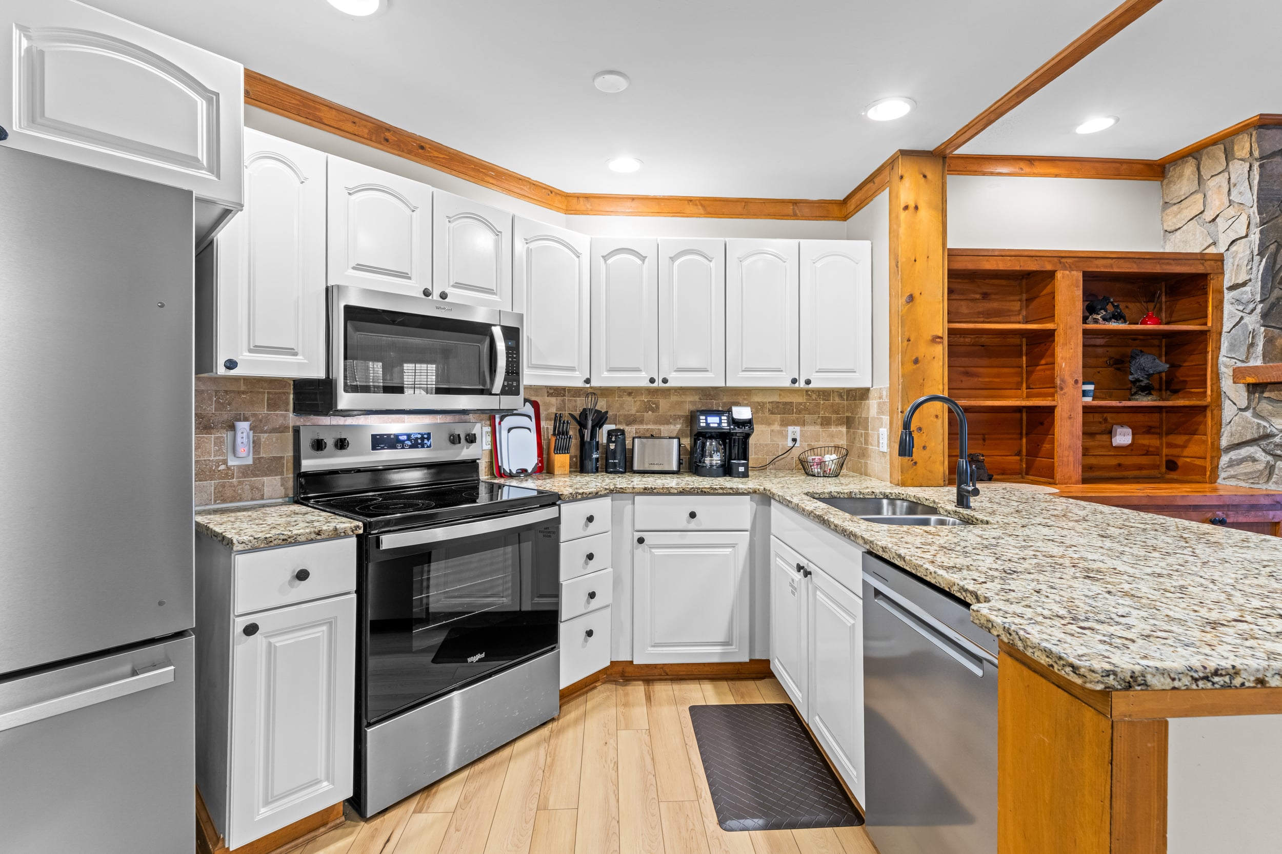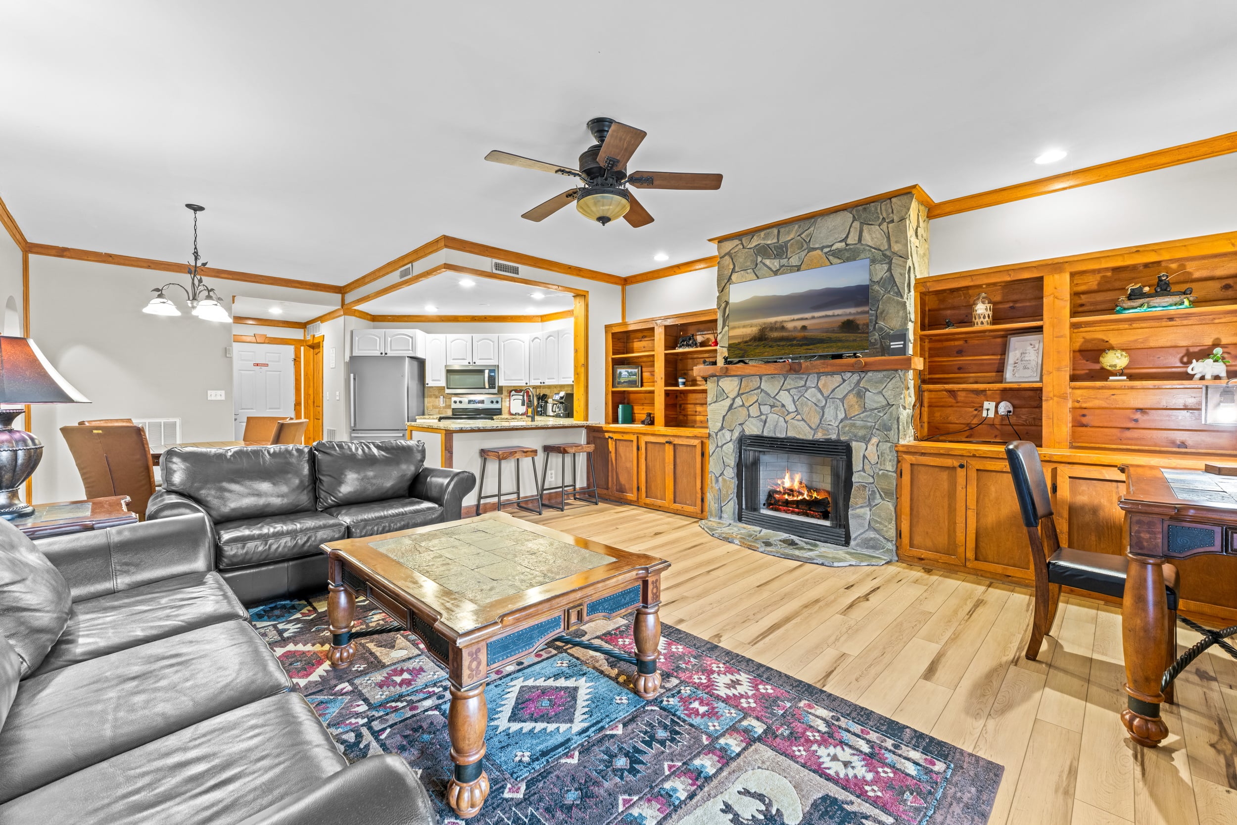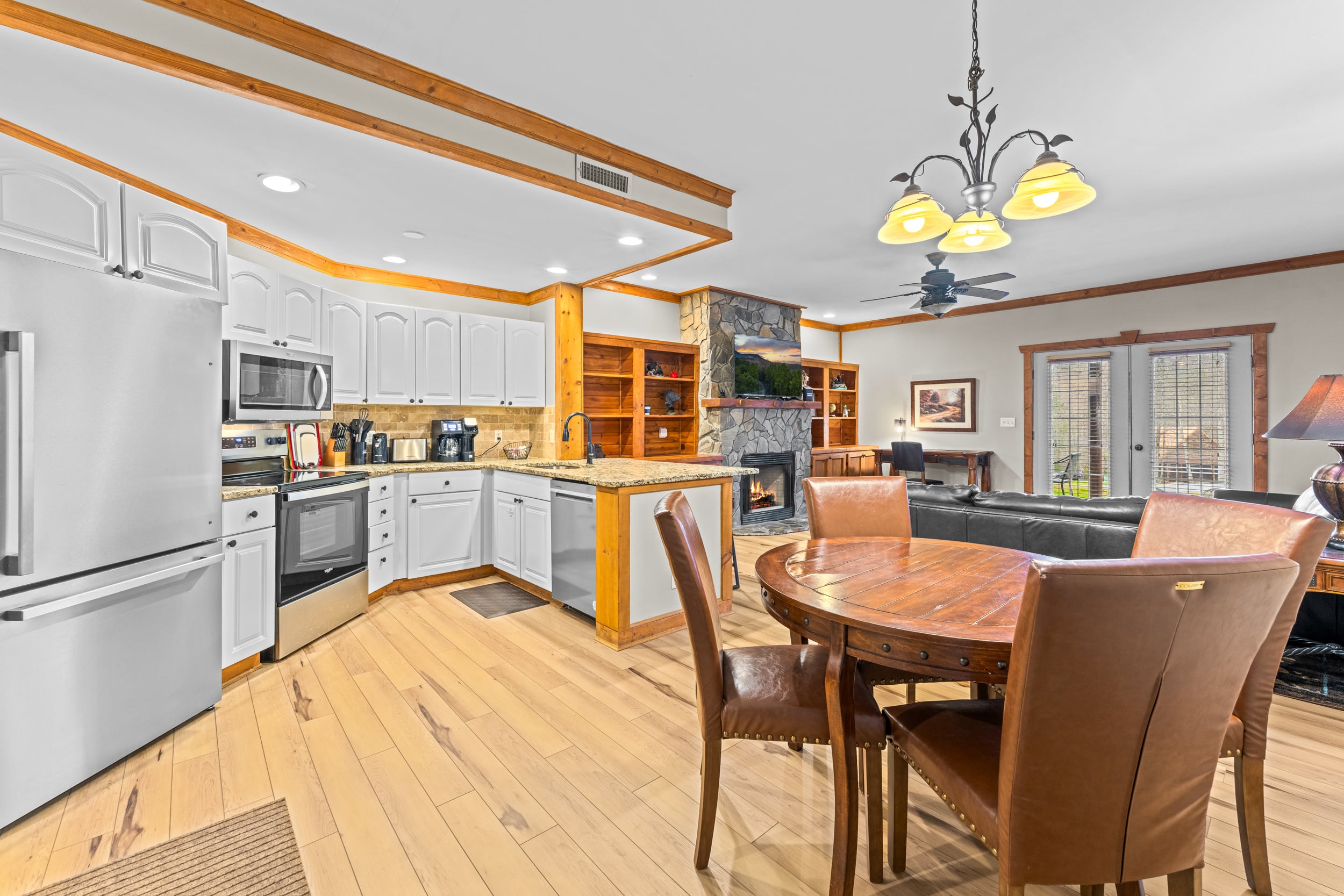 The Amenities! The Location! This is the Spot to be! Blending the tranquility of resort-living with a prime location just outside Cobbly Nob, mere minutes from downtown Gatlinburg, Cosby, Pittman Center, and the entrance to the Great Smoky Mountains National Park, this remarkable ground-floor condo is priced to sell and invites you to experience Gatlinburg in an upscale setting. This spectacular 2BD/2BA condo boasts a fantastic 1,200 square feet layout with traditional-contemporary aesthetic. Surrounded by wooded privacy, your arrival is marked by nature’s embrace. Entering White Oak Lodge and Resort, you’ll drive by the community swimming pool, tennis court, fitness center, and clubhouse. Pull right up to your unit and enter a sweeping open layout that at once feels cozy and grand. A stone fireplace radiates warmth and charm in the living room, flanked by built-in cabinetry that enhances a rustic ambiance. The white kitchen gleams with granite countertops and stainless steel appliances, while the breakfast bar carves out a place for casual dining, to help with meal prep, or simply sit and visit. Down the hall, the bedrooms are each complemented by ensuite bathrooms that enhance a heightened privacy. In the primary bedroom, you have direct access to the private flagstone patio, and archways guide the eyes to the resort-like layout of the bathroom complete with double sinks. The condo has already found success on a rental program, and there is more room in which to grow, making it a terrific investment, vacation rental, or primary residence. While close to all the excitement in downtown Gatlinburg, this unit also occupies a terrific East Gatlinburg location near hiking trails for an experience more in-tune with nature, plus it is close to I40 in Newport for ease of access without all the extra tourist traffic. With its ideal location, contemporary appeal, and upscale neighborhood charm with great amenities, this unit delivers everything you’ve been looking for in Gatlinburg living with incredible rental potential and growth! Buyer to verify all information.
